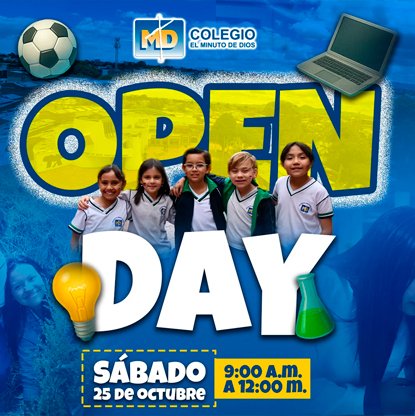 El Colegio El Minuto de Dios abre sus puertas para que vivas una experiencia única junto a tu familia y amigos. próximo sábado 25 de octubre desde las 9:00 a.m. hasta las 12:00 m.